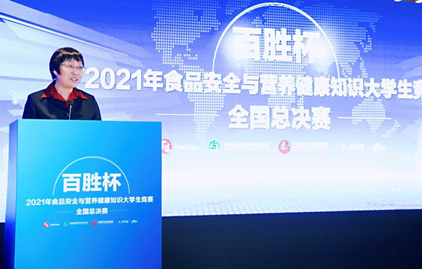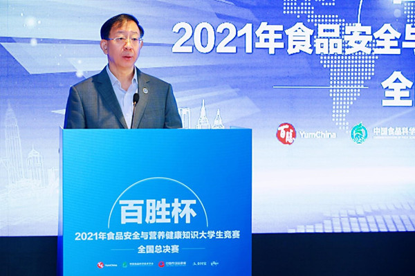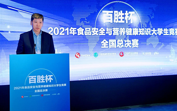 2021年“百胜杯”食品安全与营养健康知识大学生竞赛由中国市场监管报社与中国食品科学技术学会、百胜中国、支付宝答答星球共同举办,旨在进一步提升大学生食品安全素养,普及食品安全知识,并引导大学生群体培养健康的生活方式。中国工程院院士、中国食品科学技术学会理事长、北京工商大学校长孙宝国、国家市场监督管理总局食品抽检司梁钢副司长、二级巡视员郝明虹,中国市场监管报社长张霞、百胜中国首席公共事务官王立志(Alice Wang),蚂蚁集团公共事务部总经理侯琼,以及国家食品安全风险评估中心副主任樊永祥,国家粮食和物资储备局科学研究院首席研究员谭斌、国家食品发酵标准化中心原主任元晓梅出席总决赛并担任评委。