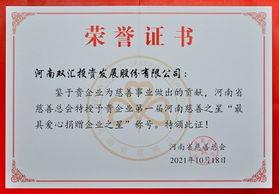 2021年10月,由河南省委宣传部、省委直属机关工委、省民政厅、省慈善总会等联合举办的庆祝中国共产党成立100周年暨河南省慈善总会建会20周年特别节目,双汇荣获第一届河南慈善之星“最具爱心捐赠企业之星”称号。
