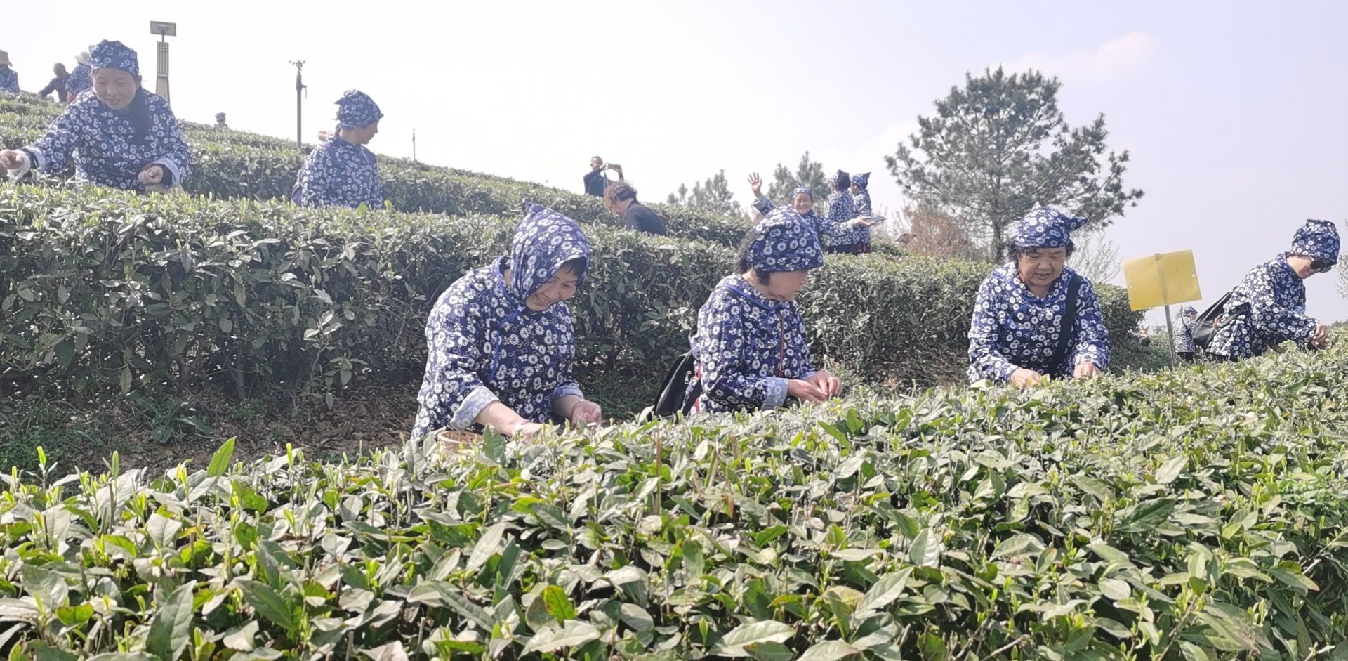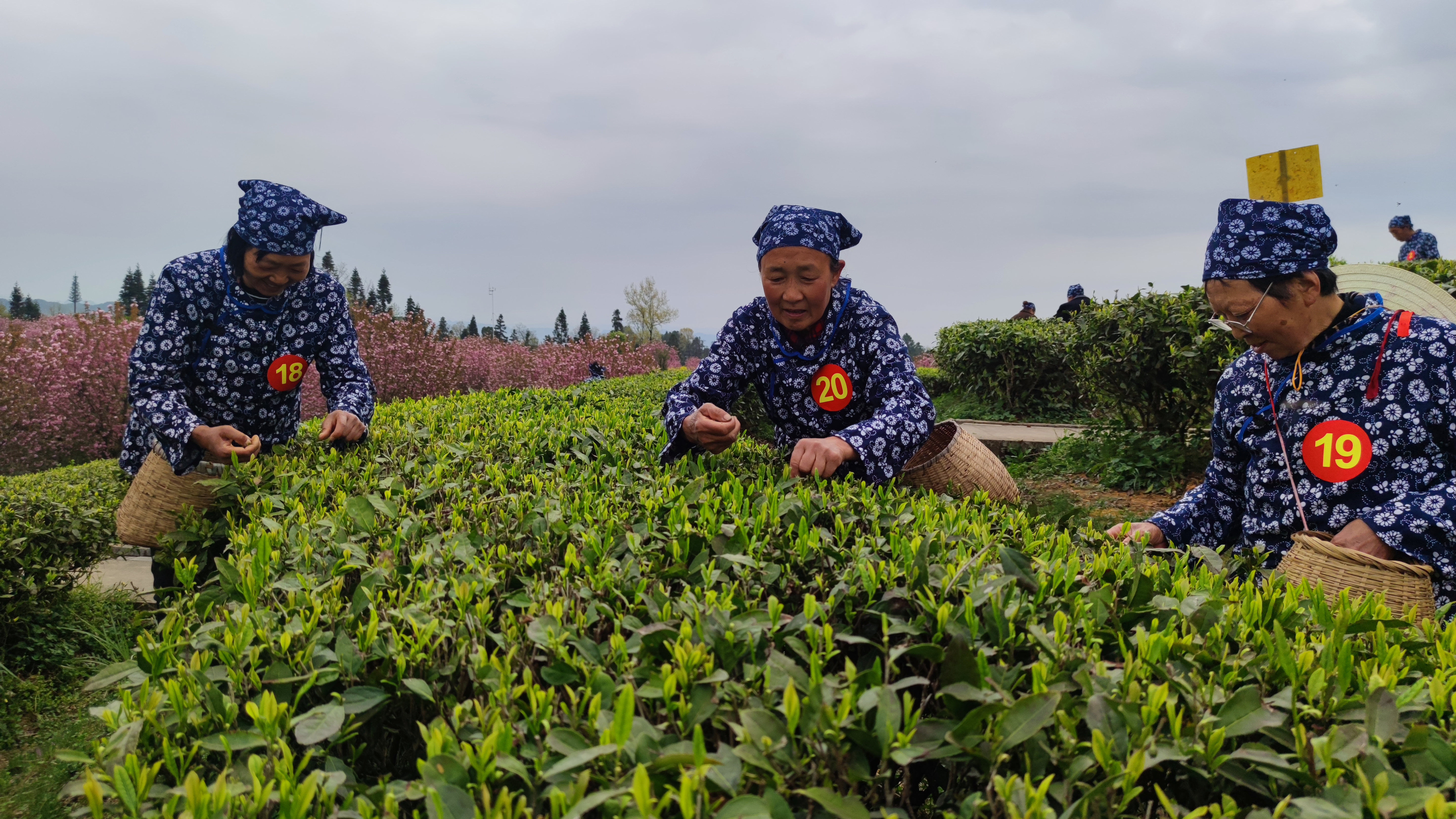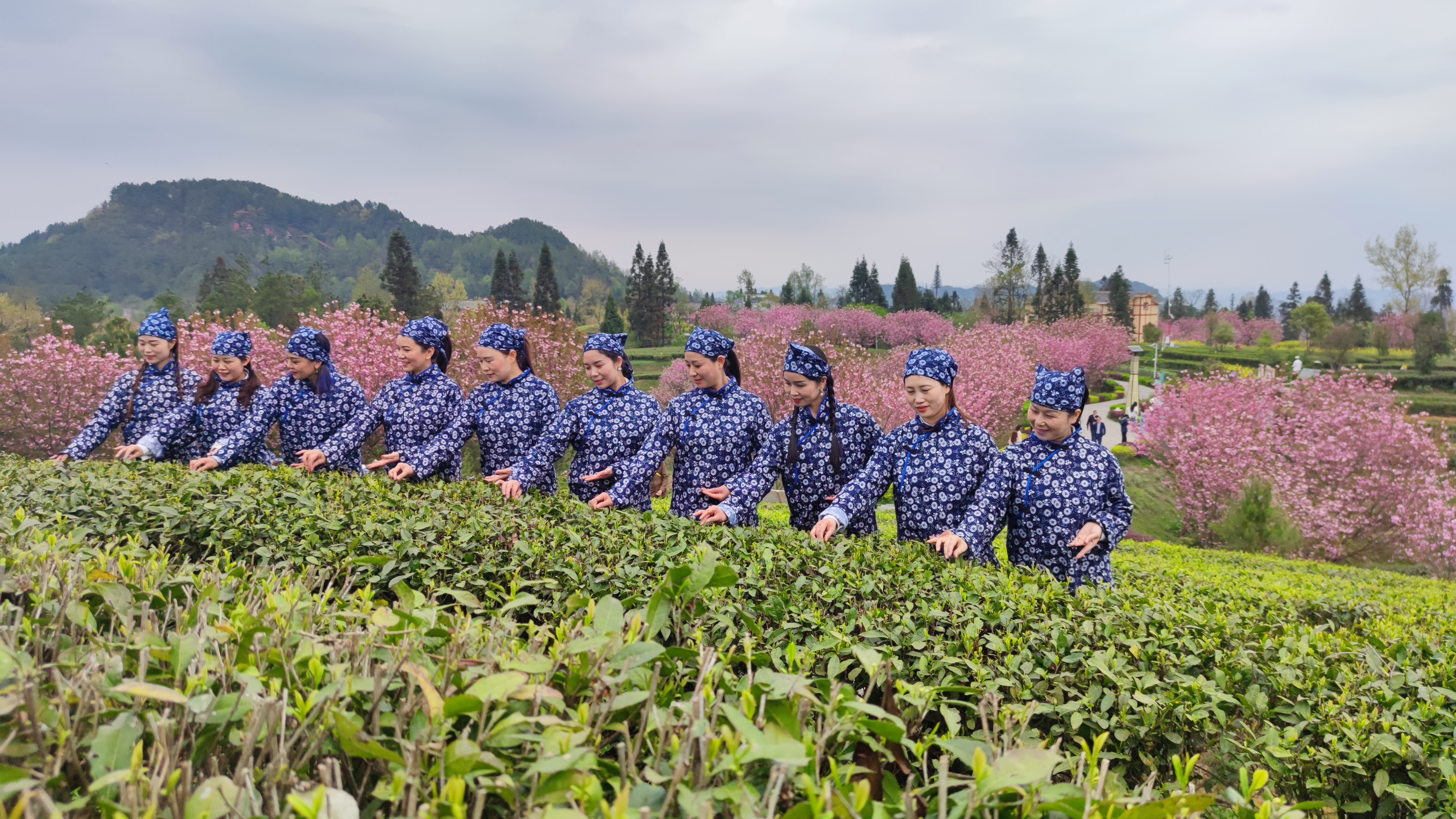 3月19日,雨后初晴,在四川平昌县三十二梁茶园里,来自广元市利州区的游客们,身穿青花衣衫,头戴青花头巾,腰挂小竹篓,正体验茶叶采摘,或歌或舞,其乐融融。平昌县走绿色生态之路,大力发展茶叶产业,以茶为媒,三产联动搅活农村一池春水,农村人气更旺,山村更美,老百姓的腰包更鼓了。