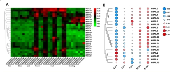 A: MdAIL基因的组织特异性表达分析;B: 基于RNA-Seq数据的苹果离体叶片不定芽再生中MdAIL基因的表达分析。(中国农业科学院果树研究所供图)