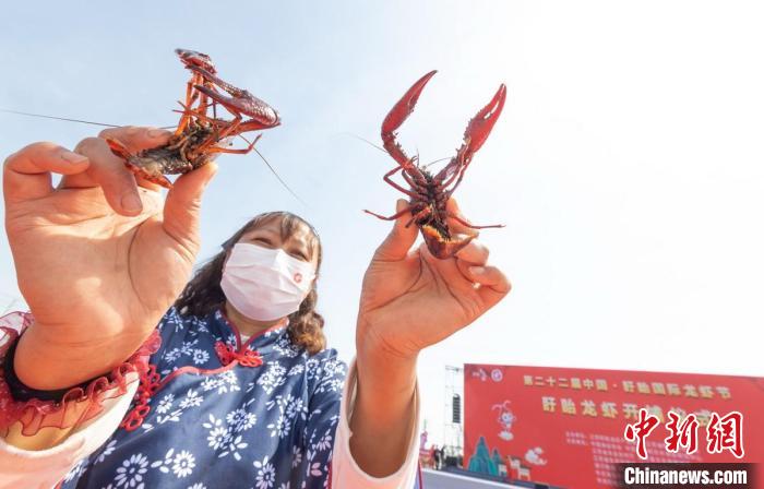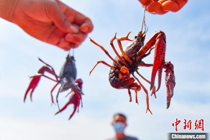江苏省淮安市盱眙县国家现代农业产业园内,当地龙虾养殖户展示捕捞到的小龙虾。 田敏 摄