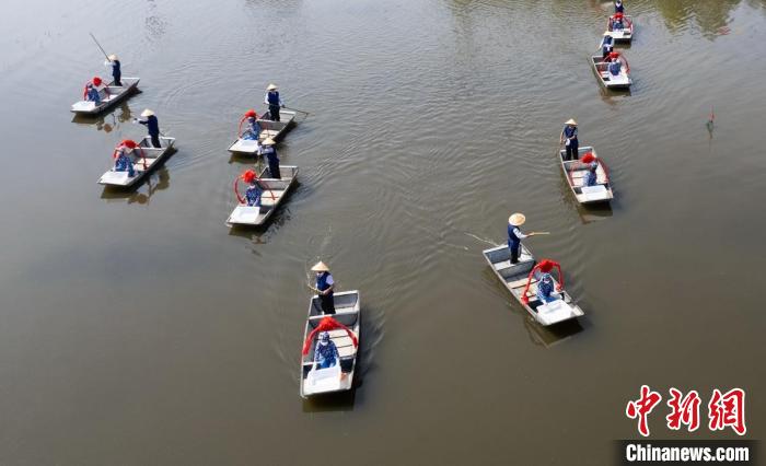 小小渔船入水捕捞小龙虾。 田敏 摄