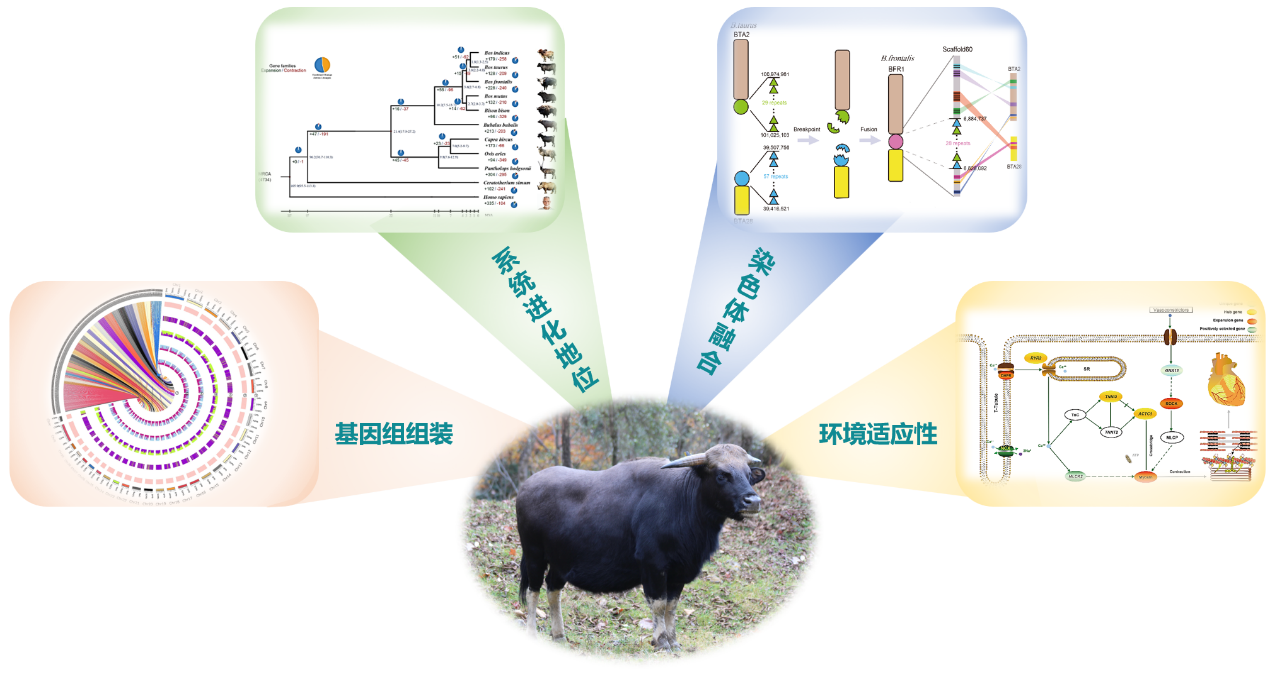 独龙牛又称“大额牛”,主要分布于云南省独龙江和怒江流域,是我国唯一的半野生半家养的珍稀牛种。我国的独龙牛与东南亚及南亚国家的大额牛一样,其起源与形成史在分类地位上尚有争议。早期研究表明,普通牛2号、28号染色体的罗伯逊易位可能形成了独龙牛的1号染色体,但缺乏基因组学层面的支持。因此,构建基因组学研究平台开展深入系统分析,成为解开独龙牛起源和演化历史之谜的钥匙。
