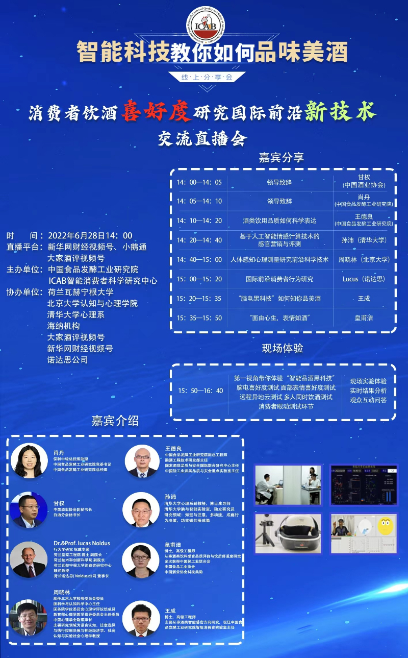 本次直播的主题为《消费者饮酒喜好度研究国际前沿新技术交流直播会》,由中国食品发酵工业研究院和ICAB智能消费者科学研究中心主办,邀请了一众专家来针对科技品酒进行研究探讨,共同展示科技之美。