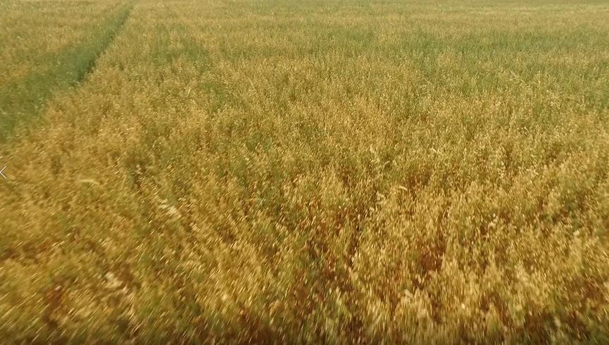 在蒙北燕麦种植基地,放眼望去,是一望无际的金色麦田。一阵风吹来,成熟的麦田似金狮起舞,麦浪翻滚,一波推动一波,空气中弥漫着燕麦成熟的清香,成熟美景近在眼前。