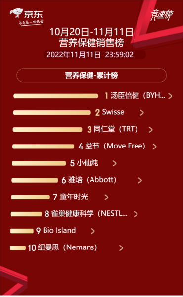 据京东商智数据②,“汤臣倍健”品牌夺得京东健康营养类目销售额TOP1;汤臣倍健京东自营旗舰店在大促开场后仅一分钟,累计销量突破10万件(统计时间:10月31日20点-11月10日20点01分),位列营养保健自营店铺销售额TOP1,并斩获京东健康平台蛋白粉类目、胶原蛋白类目TOP1。