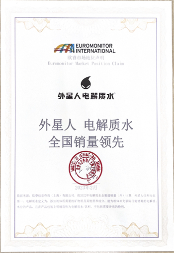 近日,权威市场调查与研究咨询机构欧睿信息咨询(Euromonitor)发布了其基于对2022年电解质水市场的研究得出的市场地位声明。声明显示,按2022年电解质水全渠道销量(升)计算,外星人电解质水全国销量领先。