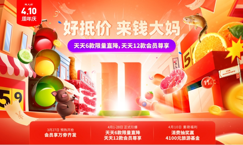 借助11周年庆,钱大妈推出“好抵价来钱大妈”会员活动。通过社群、门店、精准触达等方式进行多渠道宣导推送。自3月27日起,钱大妈周年庆预热开抢,万券齐发享不停。