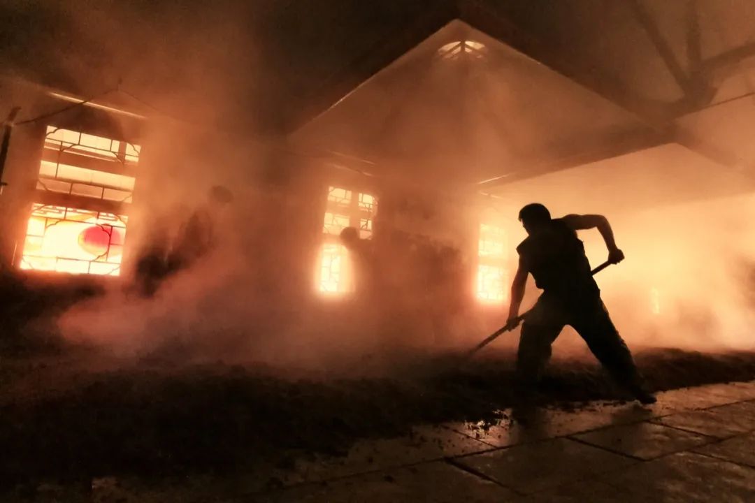 在水雾蒸腾的氤氲中,古井贡酒的酿酒师用独轮手推车将酒糟送至空地上,再用铁锹摊平待凉,仿佛通过这种纯手工的酿造方式,与车间墙壁上陈列的创业厂长聂广荣等酿造技艺传承人塑像,开展跨越时光长河的对话。