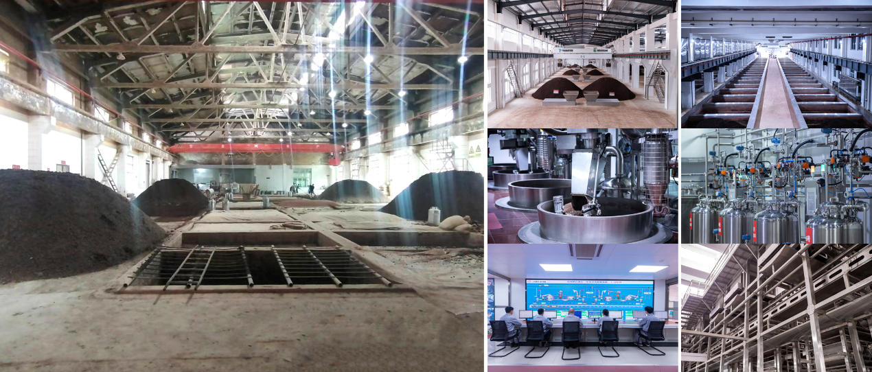 左图示:传统平铺式制酒车间 右图示:多层立体智能制酒车间
