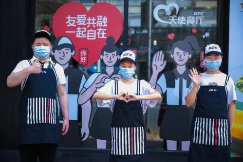 肯德基于2012 首创“天使餐厅”助残模式,其“与普通员工共事、向所有消费者提供服务”的残健共融特色,则为残障青年们打开了全面融入社会、实现更大自我价值的大门。 2022年,肯德基“天使餐厅”全面升级,从全新的标识,电子点单开始的手语问候、还有店内增加的可视化的互动装置,以及公益互动区的天使员工故事分享,通过软件与硬件的双重优化,为不同群体创造一个友爱共融的空间。