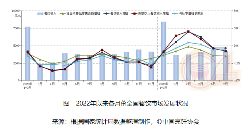中国烹饪协会分析,7月份,全国餐饮收入、限上餐饮收入增速分别较上年同期上涨17.3%、12.1%。1-7月份,全国餐饮收入、限上餐饮收入增速分别比上年同期上升27.3个、28.2个百分点。