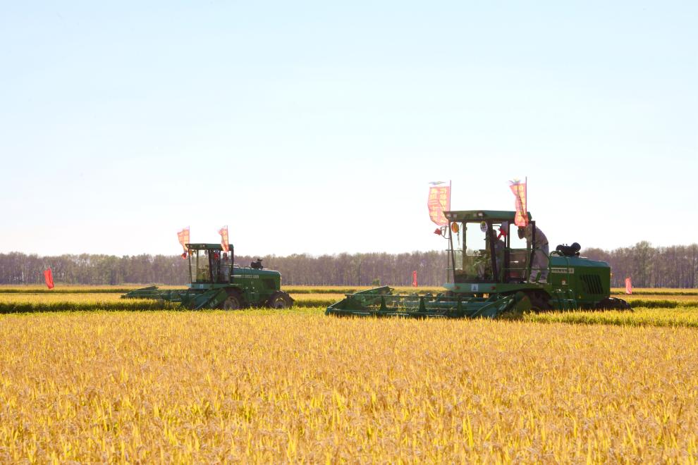 金秋九月,北大荒千里沃野一片金黄。在北大荒集团军川农场有限公司福源管理区水稻地块,一台台收割机、割晒机正在进行收获作业。种植户杨明成在农技人员的指导下率先开镰,采取直收和割晒拾禾相结合的方式进行收获。