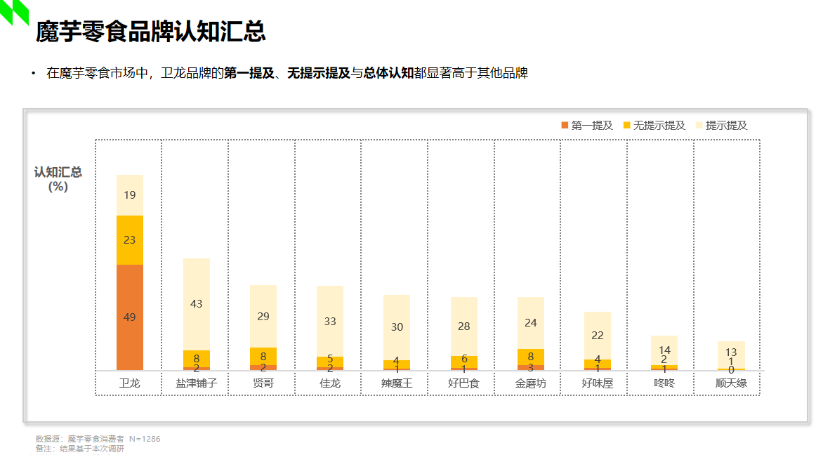 据2022年尼尔森调研显示,在魔芋市场中,卫龙品牌的第一提及、无提示提及与总体认知都显著高于其他品牌。显然,卫龙发明的魔芋爽在市场中已然奠定了良好且坚固的受众认知基础,那么“小魔女”的加入,不仅进一步充实了卫龙自身的产品矩阵,占位了“魔芋素毛肚”的产品类目,也将引领魔芋休闲食品赛道迈向更高品质的发展方向,为市场打开全新的增量机遇。