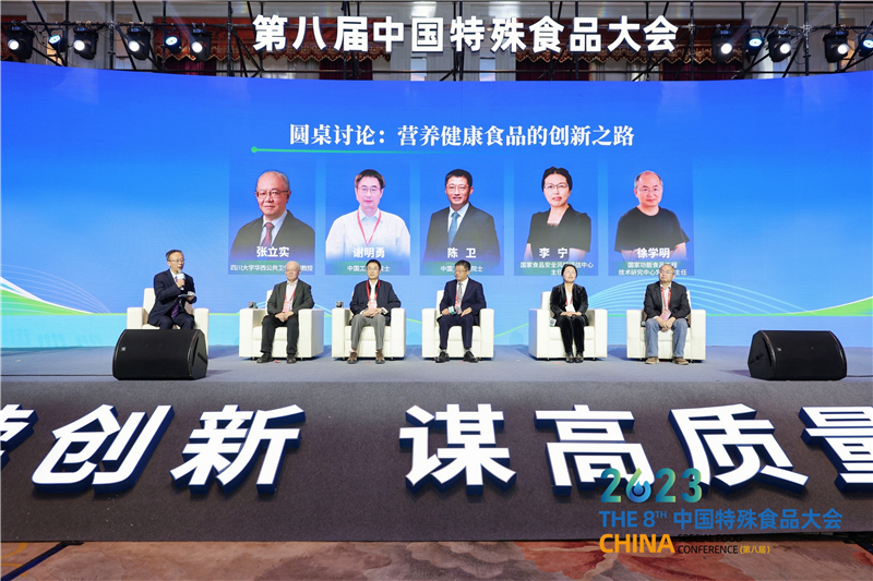 圆桌论坛嘉宾从左到右依次是中国营养保健食品协会副会长、东北农业大学食品学院院长姜毓君、四川大学华西公共卫生学院教授张立实、中国工程院院士谢明勇、中国工程院院士陈卫、国家食品安全风险评估中心主任李宁、国家功能食品工程技术研究中心常务副主任徐学明