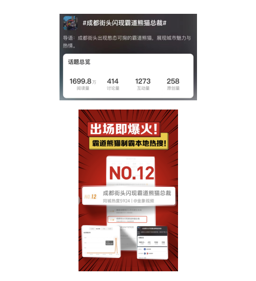 近日,卫龙新品霸道熊猫麻辣巴士席卷成都大街小巷,以霸道熊猫品牌形象打造的“熊猫”麻辣巴士霸道出街,吸引了众多消费者的目光,并凭借独特的造型和配色迅速在微博上引起了广泛关注,话题#成都街头闪现霸道熊猫总裁#成功登上了本地热搜榜。截至日前,#成都街头闪现霸道熊猫总裁#话题总阅读量达到1699万次。