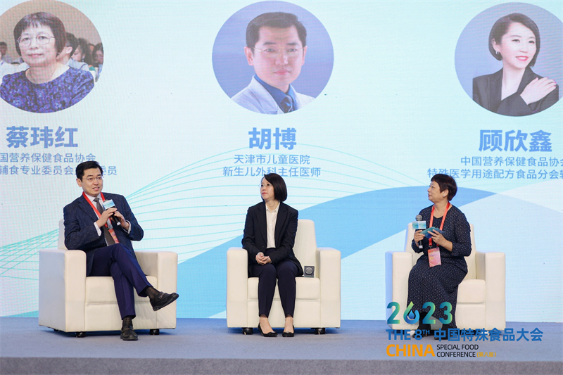 紧接着的对话讨论环节由中国营养保健食品协会婴幼儿辅食专业委员会主任委员蔡玮红主持,天津市儿童医院新生儿外科主任医师胡博、中国营养保健食品协会特殊医学用途配方食品分会轮值主席顾欣鑫参与了对话讨论,并发表了各自对于特殊医学用途配方食品的实际应用思考。