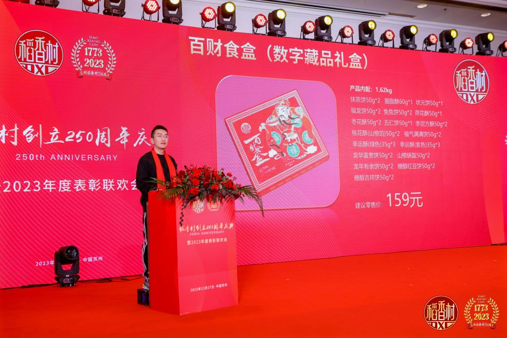 近日,在苏州举办的“稻香村创立250周年庆典”现场,稻香村集团副总经理、营销中心总经理周立源发布了中式糕点、坚果、熟食等10款龙年年货新品礼盒,迎接即将到来的龙年春节销售季。据悉,稻香村各类年货礼品将于1月上旬全面在线上线下开始销售。