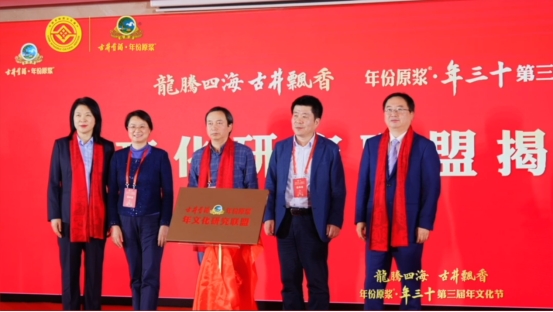 年文化研究联盟揭牌(从左往右:古井集团党委委员、副总裁程莉,安徽省文化和旅游厅党组成员蔡小莉,华东师范大学特聘教授、中国智慧研究院院长贡华南,安徽广播电视台党委书记、台长、总编辑吴文胜,南京大学历史学院院长张生。)