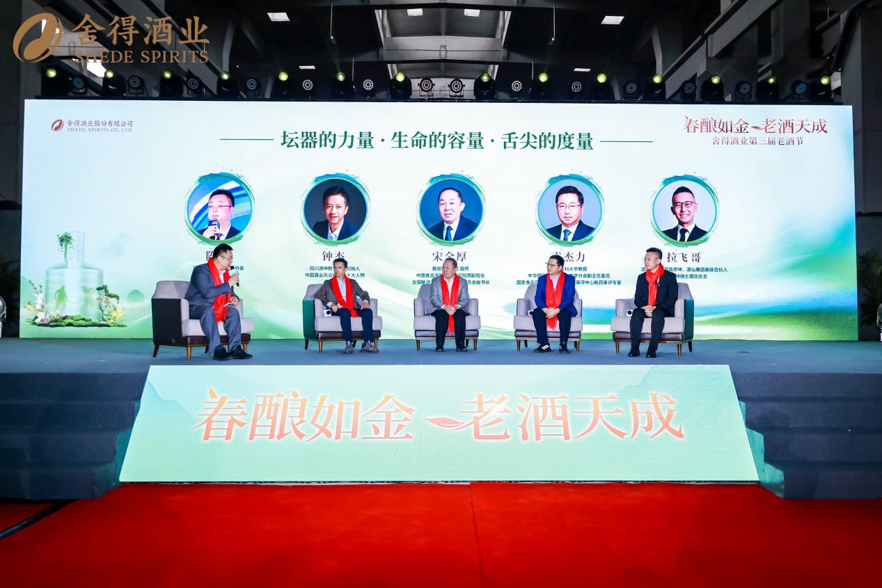 在四川中国白酒金三角酒业协会副秘书长陈雷主持下,全国白酒工业标准化技术委员会秘书长宋全厚,中国著名白酒专家、源坤教育创始人钟杰,大连医科大学教授袁杰力,酒仙集团高级合伙人拉飞哥四位各领域的专业人士,以“坛器的力量 生命的容量 舌尖的度量”为主题,从专业角度讲述老酒故事,辨析坛储老酒的品质价值,探讨如何用科技为老酒品质保驾护航,让更多消费者体验舍得老酒的独特魅力。