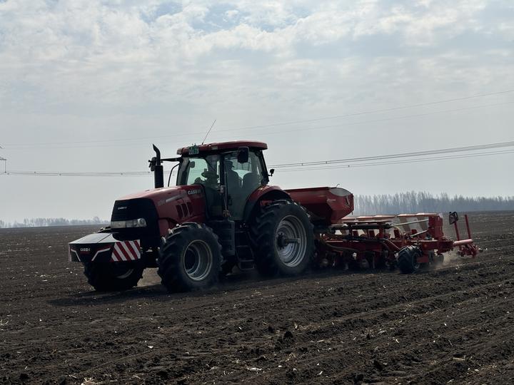 在黑龙江省绥化市北林区宝山镇宝山村,立军现代农机合作社地块里,两台大马力拖拉机拖拽着气吸式播种机正在进行播种作业。伴着机车发出的轰鸣声,合作社工作人员马春风大声说:“今年地偏涝,播种推迟了几天,现在正加快进度。”