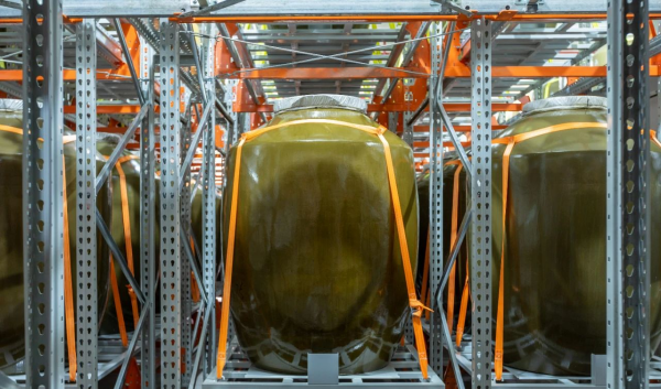 国台酒庄规划有6栋数字化智能酒库,每栋储酒1万吨,每一栋分为5层,同时设计为双层结构,相当于10层。每层又设置为两层钢架,底下一层为吨坛,上面一层为千斤坛,存放着国台各年份的老酒和基酒。
