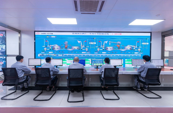 走进国台制酒车间,与上午的传统酿酒车间截然不同:这里没有大汗淋漓的酿酒工人,从事繁重的体力劳动,而是员工坐在入口处的中控室操作车间中央控制系统,实时监控车间内机器运转情况和数字参数。