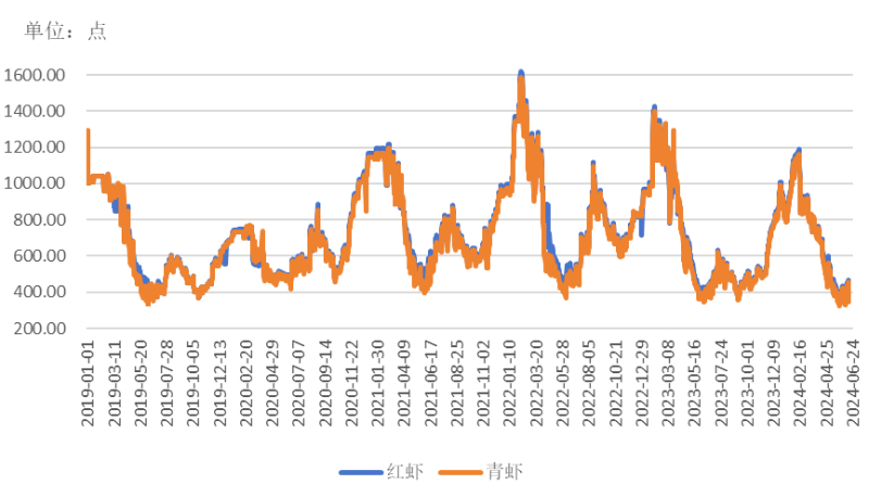 红虾和青虾价格指数走势对比(单位:点)