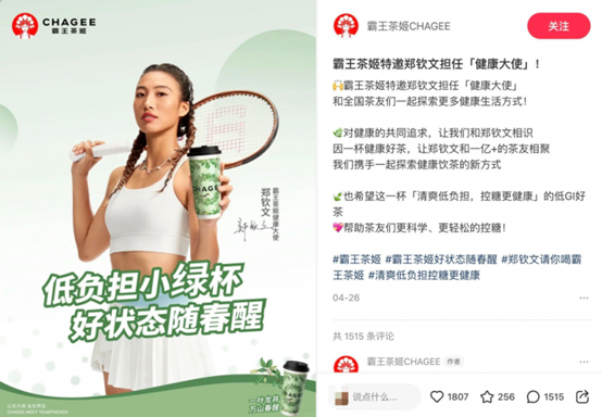 除了郑钦文,霸王茶姬也合作了多位冠军健康大使,包括田径传奇刘翔、游泳名将汪顺、羽坛“凡晨组合“贾一凡和陈清晨、霹雳舞运动员刘清漪和王瑞苗。
