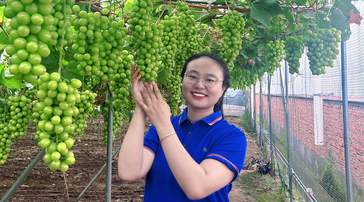 新洋丰农艺师李蒙察看阳光玫瑰长势