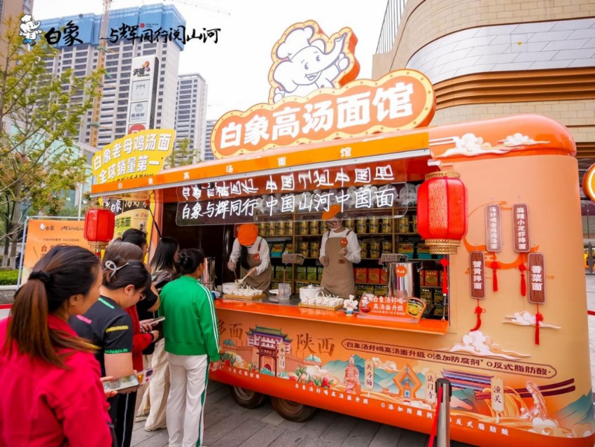 此次陕西行活动期间,白象高汤面馆不仅在行至宝鸡时亮相与辉同行阅山河直播间,搭建起与万千线上观众的味蕾链接,更是全新升级营业模式,走出直播间深入龙湖西安香醍天街,与消费者线下面对面互动交流。