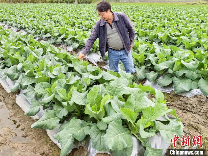 11月23日,广东台山市都斛镇,竞丰村党支部书记、菜花种植能手文瑞明在菜田里查看菜花生长情况。李晓春 摄