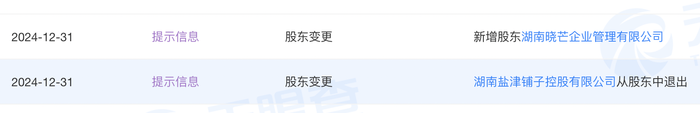 记者查询天眼查工商资料发现,2024年12月31日,零食量贩连锁品牌零食很忙和赵一鸣的母公司湖南鸣鸣很忙商业连锁有限公司发生了股东变更信息,其中,湖南盐津铺子控股有限公司从股东中退出,取而代之的的是“湖南晓芒企业管理有限公司”,后者于2024年12月5日成立,由津东(香港)控股有限公司控股。