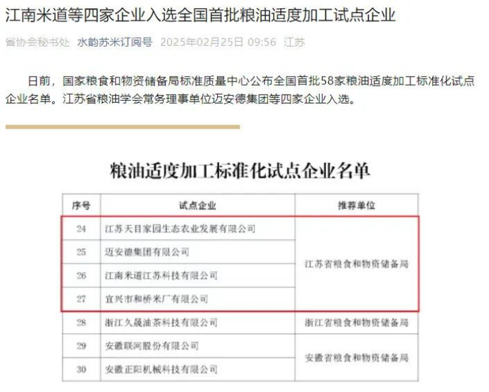 日前,国家粮食和物资储备局标准质量中心公布全国首批58家粮油适度加工标准化试点企业名单,江南米道江苏科技有限公司实力入选。