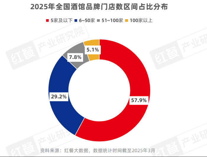 然而,从整体上看,酒馆赛道的连锁化程度仍有较大的提升空间。据红餐大数据,大部分酒馆品牌门店数集中在5家及以下区间,占比57.9%;而100家以上的大型酒馆品牌占比较低,仅为5.1%,表明市场仍有较大的整合空间。