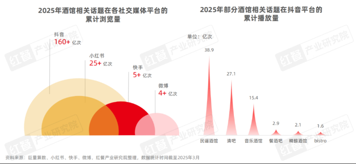 因此,近年来酒馆在社交媒体上受到了广泛关注和讨论。截至2025年3月,在抖音平台上,酒馆相关话题的累计浏览量超160亿次,同时,快手、小红书上的相关话题也收获上亿级别的浏览量。具体来看,“民谣酒馆”“清吧”“音乐酒馆”是关注度相对较高的话题,部分与之相关的酒馆品牌的相关话题同样收获了较高的关注度。