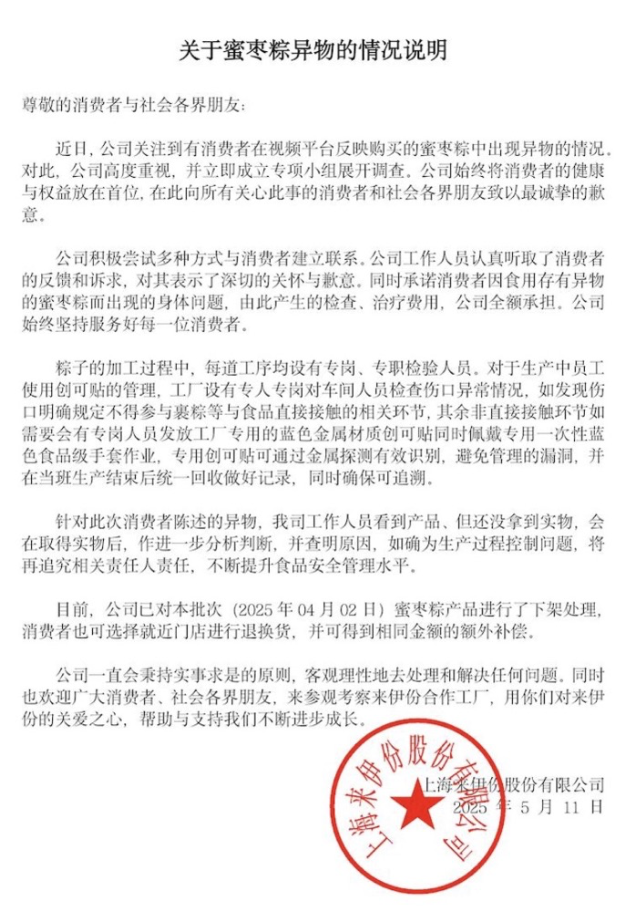 5月12日凌晨,来伊份发布关于蜜枣粽异物的情况说明:公司关注到蜜枣粽中出现异物的相关情况。已积极尝试多种方式与消费者建立联系,公司工作人员认真听取了消费者的反馈和诉求,对其表示了深切的关怀与歉意。同时承诺消费者因食用存有异物的蜜枣粽而出现的身体问题,由此产生的检查、治疗费用,公司全额承担。