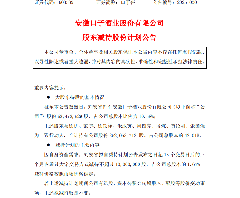 新华网北京7月30日电(冯孔)近日,口子窖(603589.SH)一则公告,再次让市场将目光聚焦这家徽酒企业。公告显示,公司股东刘安省计划自减持公告发布之日起15个交易日后的三个月内,即2025年8月12日至2025年11月11日,通过大宗交易方式减持不超过1000万股口子窖股票,占公司总股本的1.67%,减持价格按照市场价格确定。