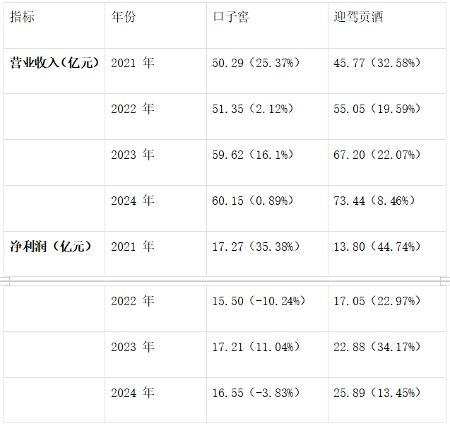 2024年,白酒行业深度调整,口子窖业绩依旧承压。当年,口子窖实现营业总收入60.15亿元,仅同比增长0.89%,归母净利润16.55亿元,同比下滑3.83%。反观迎驾贡酒,2024年实现营收73.44亿元,同比增长8.46%,归母净利润25.89亿元,同比增长13.45% 。口子窖不仅在营收和净利润的绝对数值上远低于迎驾贡酒,在增长幅度上的差距也愈发明显。