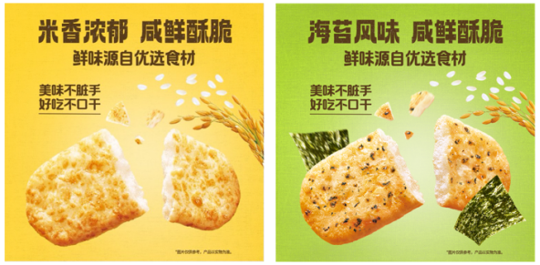 今年延伸出的牛乳味裸米饼(甜口味),以及全新推出的“裸鲜贝”(咸口味),进一步把这种“吃得安心”的理由说清楚:选用东北大米为原料,以玉米发酵粉、香菇粉、烤海苔粉等自然食材替代味精,既保留了米香的自然风味,又减少了消费者的担忧。