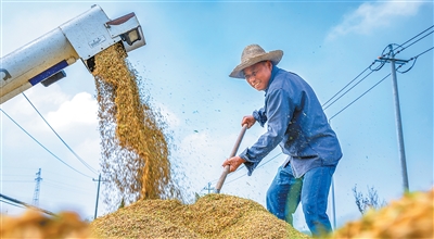10月8日,在安徽省芜湖市繁昌区峨山镇城东村,农民在收获水稻。