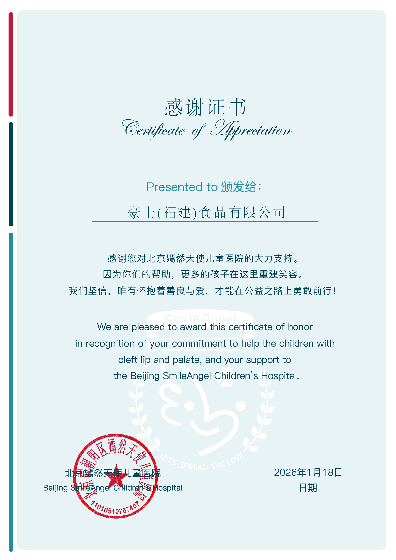 作为始终心系社会的企业,豪士面包以实际行动践行企业社会责任,为嫣然天使儿童医院、医护人员与患儿家庭送去及时的支持与温暖。豪士相关负责人表示:“我们希望能通过这份力所能及的帮助,支持孩子们不中断的治疗之路,与院方共渡难关。”同时,豪士面包也表示将持续关注医院的发展与实际需求,在必要时提供进一步协助。