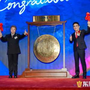 上市仪式中,东鹏饮料集团董事长、总裁林木勤与东鹏大咖品牌代言人韩红共同敲响上市金锣,标志着东鹏饮料正式登陆港交所,开启A+H新征程。