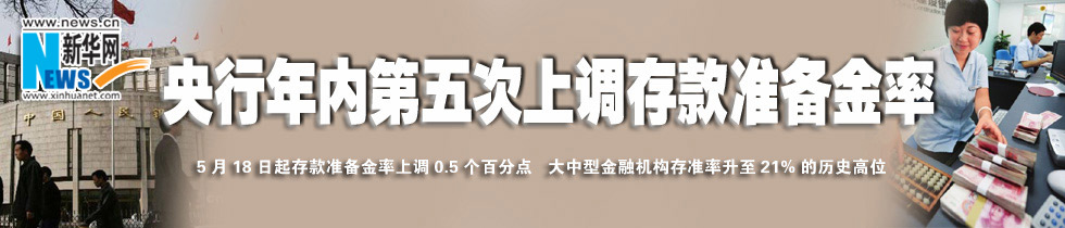 央行12日晚间宣布,从5月18日起,上调存款准备金率0.5个百分点。这是央行年内第五次上调存款准备金率,也是去年以来第十一次上调。本次上调大约可锁定商业银行3700亿元资金。 [详细]