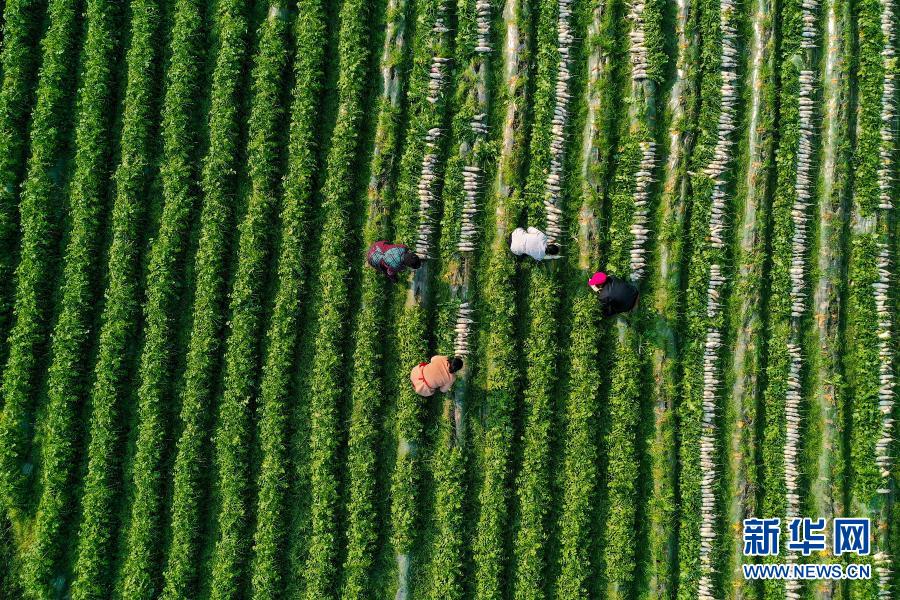重庆市黔江区白石镇凤山村村民在抢收萝卜(2021年1月15日摄,无人机照片)。新华社发 (杨敏 摄)