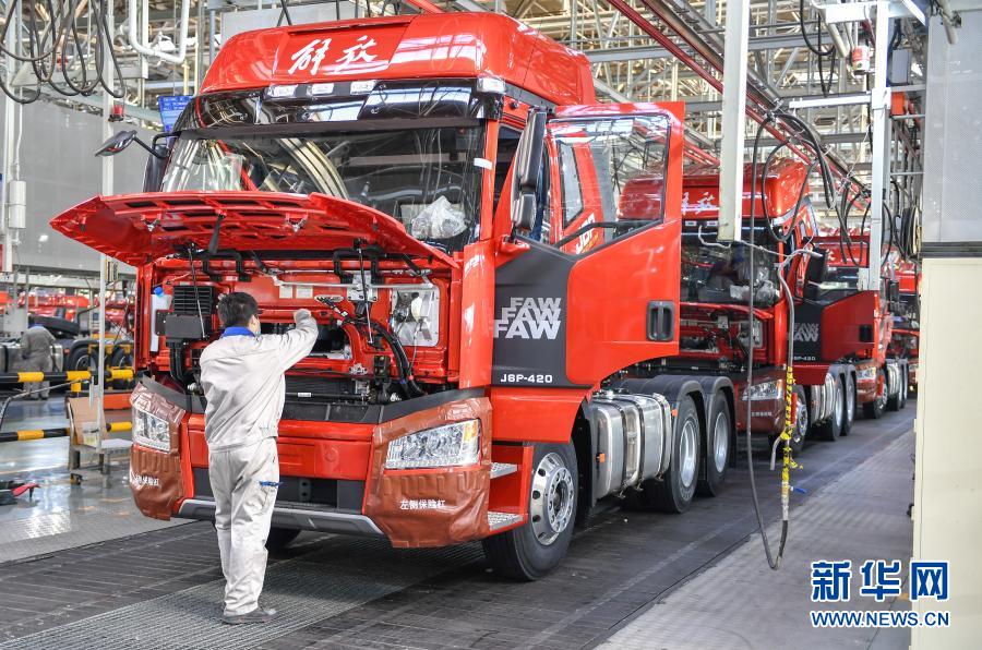工人在位于长春的一汽解放总装车间装配车辆(2021年1月5日摄)。新华社记者 张楠 摄