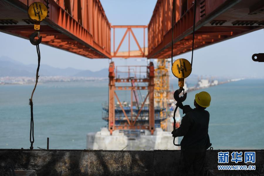 中铁十一局工人在新建福厦铁路湄洲湾跨海大桥建设现场施工(2020年11月2日摄)。新华社记者 宋为伟 摄