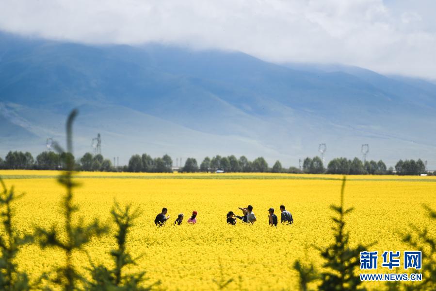 游客在青海门源回族自治县的油菜花田中拍照(2020年7月22日摄)。新华社记者 吴刚 摄