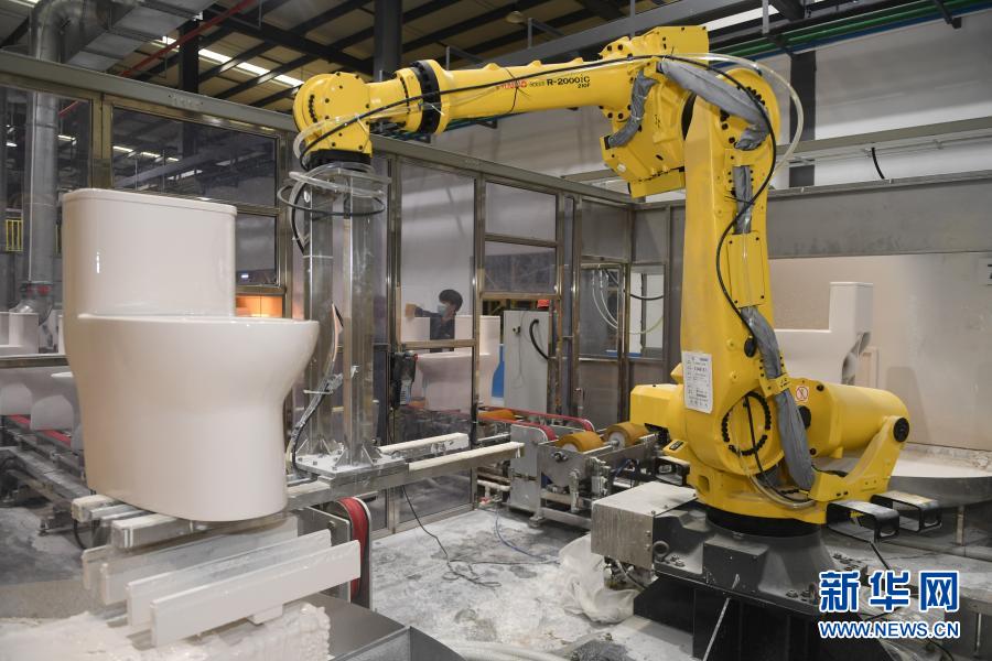 在福建省泉州市永春县,智能机器人在福建省首家5G智慧陶瓷工厂——九牧永春智慧制造产业园区101#智慧工厂生产洁具(2021年1月13日摄)。新华社记者 宋为伟 摄