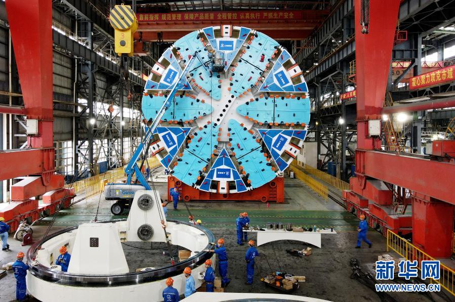 在隧道股份上海隧道工程有限公司机械制造分公司生产车间,工人对“骐跃”盾构机进行安装调试(2020年10月15日摄,无人机照片)。新华社记者 方喆 摄